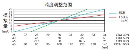 激光位移傳感器CD3系列產(chǎn)品特點(diǎn): ● 采用高精度CMOS感光元器件。 ● 模擬量輸出設(shè)有跨度(SPAN)和歸零設(shè)定功能,以滿足各種 應(yīng)用的需求。 ● 可預(yù)設(shè)模擬量的上下限值作為報(bào)警輸出。 ● 內(nèi)置數(shù)字顯示器。 ● 按鍵示教,數(shù)顯面板,操作簡便。簡易的示教按鍵,便于監(jiān)視的數(shù)字顯示器。 ● 無論是反射率高的光澤面,還是如黑色橡膠等低反射率的物體,CD3系列均能穩(wěn)定測(cè)量。 ● 電壓輸出轉(zhuǎn)換器CV-15 若需要將4-20mA模擬電流輸出轉(zhuǎn)換成1-5V模擬電壓輸出,則可連接電阻CV-15 。 ● 偏移值 設(shè)定偏移值是一個(gè)補(bǔ)償功能,可對(duì)正負(fù)極模擬輸出值進(jìn)行反轉(zhuǎn)。 設(shè)定范圍為傳感器檢測(cè)距離的±50% 。 ● 跨度調(diào)整 調(diào)整跨度值改變測(cè)量值(位移量)與距離之間的比例關(guān)系。 設(shè)定范圍為傳感器檢測(cè)距離的±50% 。 ● 超出量程時(shí)的模擬量輸出保持功能 當(dāng)模擬量值超出量程時(shí),有如下兩種保持功能可選: CLP 模式:模擬量值保持輸出24mA ; HOLD 模式:模擬量輸出值為正常測(cè)量時(shí)的后一個(gè)測(cè)量值。 激光位移傳感器CD3系列技術(shù)參數(shù):