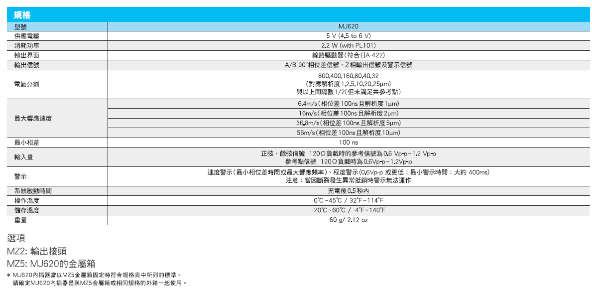 MJ620內(nèi)置接收器, 可從差分線路驅動器產(chǎn)生A/B相90°相位差信號, AZ相位輸出信號及警示信號; 細分數(shù)最大800; 響應速度最大56m/s; 最大相位差100ns; 配用產(chǎn)品:PL101,MZ2,MZ5,SL700。 品特性: 產(chǎn)品特性: MJ620內(nèi)置接收器 適用于各種工廠作業(yè)環(huán)境,耐油水灰塵,抗震動沖擊能力強