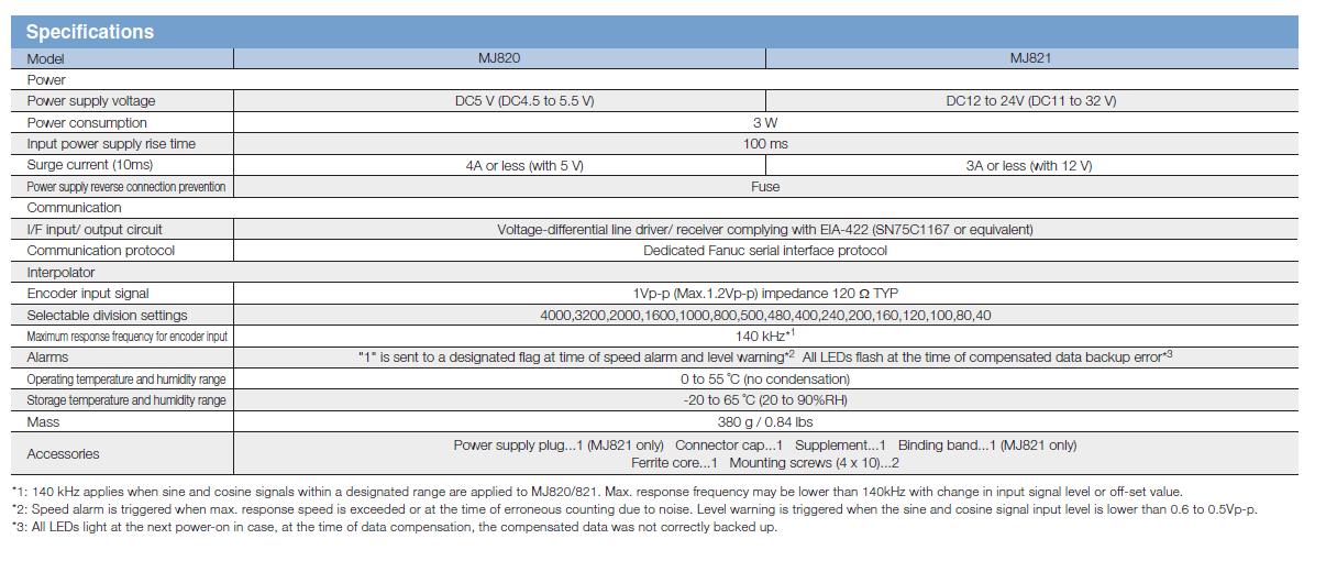 產(chǎn)品介紹簡(jiǎn)單介紹: 磁尺信號(hào)內(nèi)置器MJ820/MJ821; 允許直流補(bǔ)償、增益補(bǔ)償、相位差補(bǔ)償, 配用產(chǎn)品:PL101,SH12.適用于FAUNC公司專用串列式介面協(xié)議。 產(chǎn)品特性: 產(chǎn)品特性: 輸入阻抗 Input impedance:120 Ω 差動(dòng)輸入電壓 voltage differential input:1 Vp-p 最高響應(yīng)頻率 Max. response frequency:140 kHz for any number of divisions selected 可選細(xì)分倍率 divisions:40,80,100,120,160,200,240,400,480,500,800,1000,1600,2000,3200,4000 電源 Power supply:MJ820 DC 5V(4.5-5.5V);MJ821 DC 12V-24V(11V-32V) 兼容 Compatible:SL700 series 數(shù)字磁尺及PL101 傳感器讀磁頭 補(bǔ)償 Compensation: DC offset, gain and phase (直流偏移 幅度補(bǔ)償 相位補(bǔ)償) 可連接各種通用模擬信號(hào)輸出編碼器